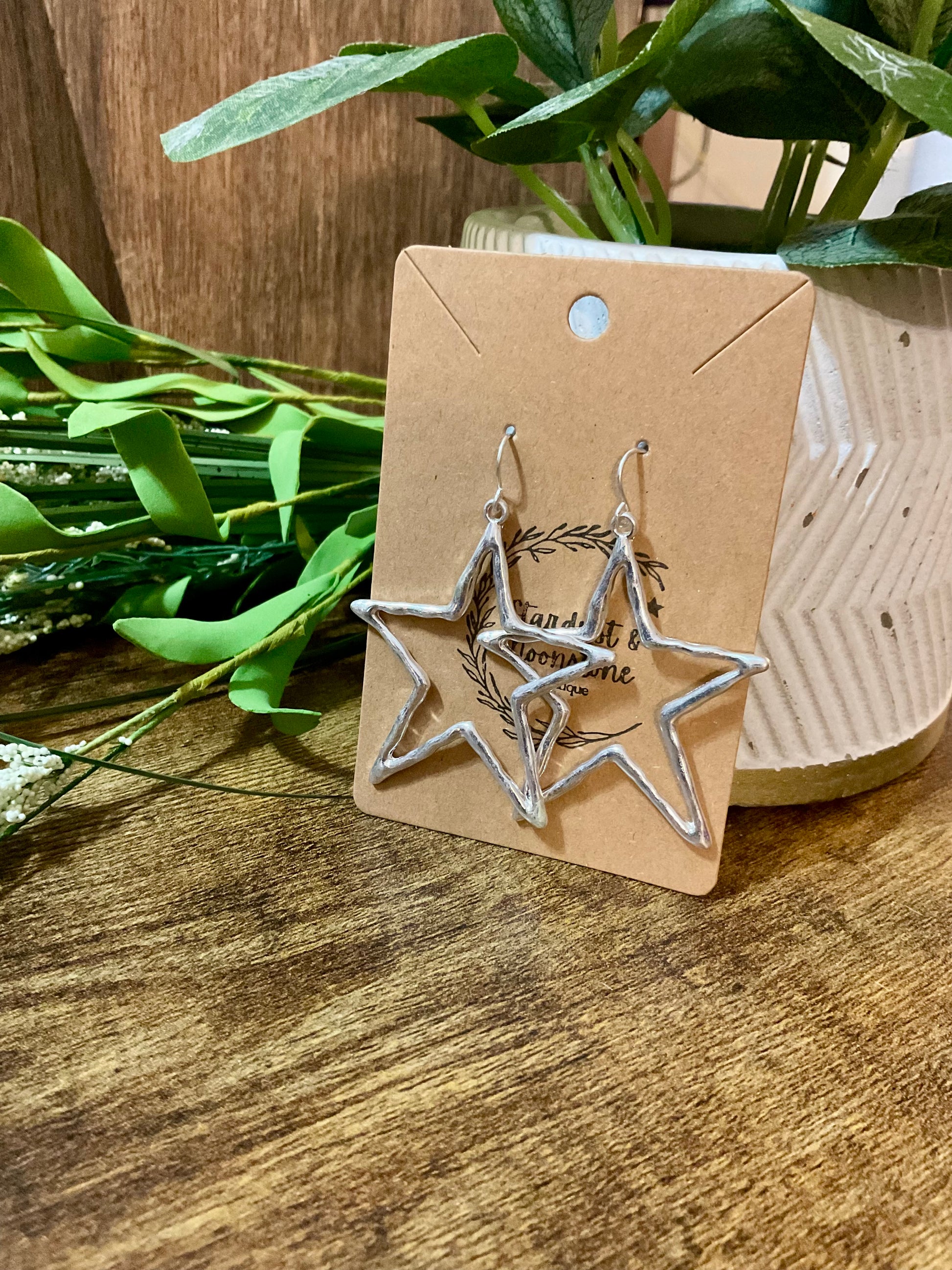 Expertly crafted, these Silver Star Hammered Metal Earrings showcase a 1 3/4 x 1 3/4 inch metal star design. With precise detailing and a unique hammered texture, these earrings make a bold statement while adding a touch of sophistication to any outfit. Shine like a star with these elegant earrings.