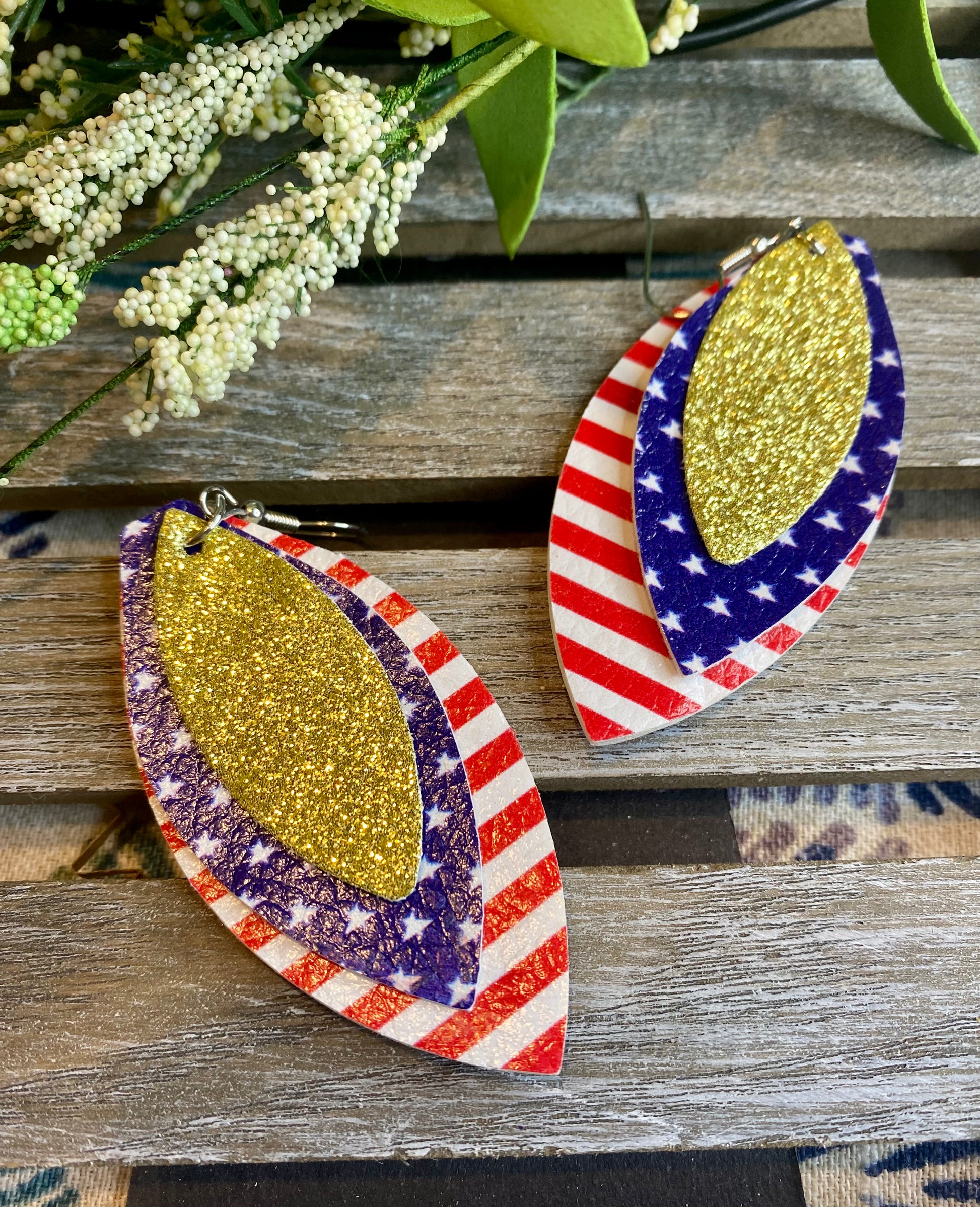 Faux leather teardrop earrings with Stars and Stripes flag design.