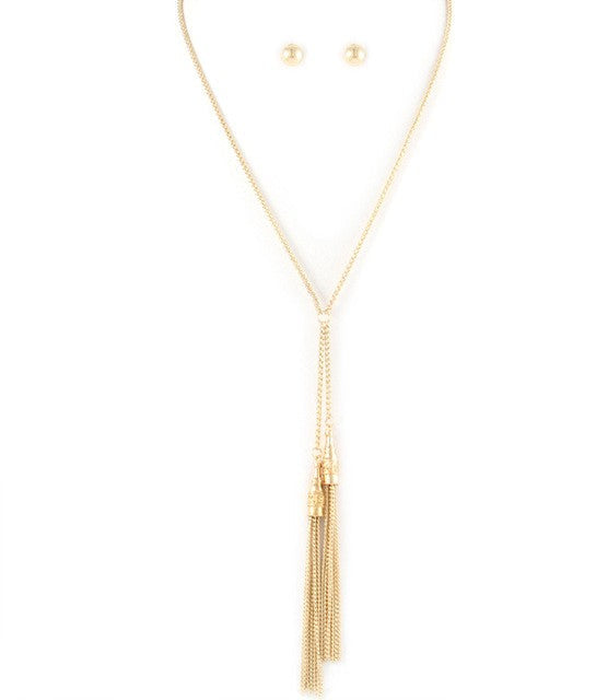 Embrace chic boho style with our Gold Lariat Necklace and Stud Earrings Set. This trendy and versatile set features a long y-chain necklace with a tassel pendant and gold stud earrings. The necklace is punctuated with tassel ends and has a lobster clasp closure, perfect for any occasion. The set is made of high-quality iron alloy, making it a must-have for your casual or formal looks.